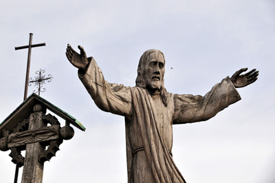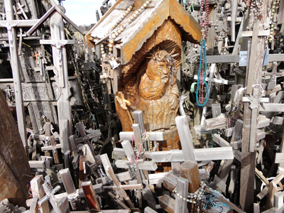 Jest kilkumetrowej wysokości figura Chrystusa wyrzeźbiona w jednym, popękanym już pniu, i osobno przymocowanymi później rozłożonymi rękoma. Widzę krzyże – kapliczki, oraz samodzielne, na wysokich palach. Kolejnego drewnianego Jezusa niosącego potężny krzyż, jak na Golgotę.