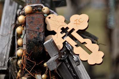 W innych miejscach krzyże prawosławne, wśród nich wpisane, a ściślej wycięte pośrodku katolickiego, jak negatyw. Oglądam i fotografuję różne dedykacje i intencje, z jakimi krzyże przynieśli tu wierni i pielgrzymki. Także polskie.