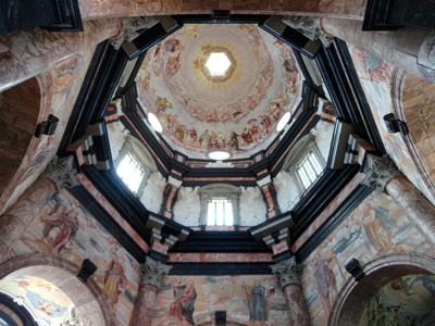 Pokrywa go wznosząca się na wysokość 50 metrów kopuła zakończona wieżyczką – latarnią. Obok głównego wejścia stoją natomiast, wysunięte nieco do przodu przed linię zabudowań klasztornych, dwie bliźniacze, 32-metrowe wieże. Do wnętrza – nawy głównej, też sześciobocznej – z głównego wejścia niegdyś wchodziło się przez pokrytą freskami sień.