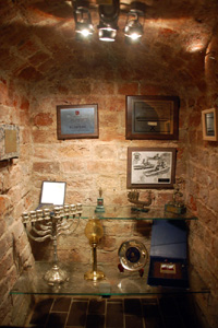 Dosyć jednak ubogie, jeżeli chodzi o eksponaty demonstrowane w podświetlonych korytarzowych wnękach. Głównie są to przedmioty z wykopalisk i różnych odzysków. Trochę starej broni, ceramiki, metalowych naczyń, sprzętów domowych i gospodarczych, jakiś siedmioramienny świecznik, pruski mundur i hełm, sztychy, fotografie, dokumenty. A także kilka manekinów w dawnych strojach.