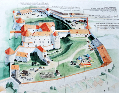 Jednym z dwu najcenniejszych zabytków miasta jest zespół zamkowy na wzgórzu oraz kościół św. Jana w jego pobliżu. Ten pierwszy, to ruiny dawnego gotyckiego zamku Zakonu Kawalerów Mieczowych i siedziba ich Wielkiego Mistrza, później zaś polskich starostów. W średniowieczu druga pod względem wielkości i znaczenia forteca w Inflantach. Zrujnowana częściowo w 1577 roku oraz znacznie podczas kolejnej wojny Szwecji z Rosją w 1703 roku. W 1777 roku, już w okresie rosyjskiego panowania w Inflantach, zamek ten otrzymał, wraz z otoczeniem, hrabia Jakob Sievers (1731-1808), zasłużony dla carycy Katarzyny II i jej imperium w przeprowadzeniu II rozbioru Polski.