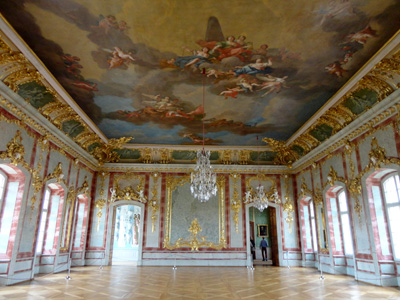 Ich ekspozycja tworzy więc wspaniałą, zachwycającą całość. Za najwspanialszą w pałacu uważana jest sala tronowa zwana Złotą. Zdobią ją malowidła stropowe wspomnianych Włochów: Martiniego i Zucchiniego. Przedstawiają one cnoty: Siłę, Mądrość, Prawdę, Szczodrość i Doskonałość. Po środku zaś apoteozę księcia Ernsta Johanna Birona.