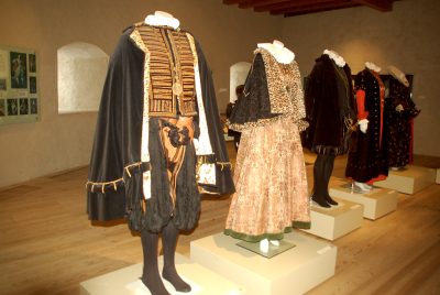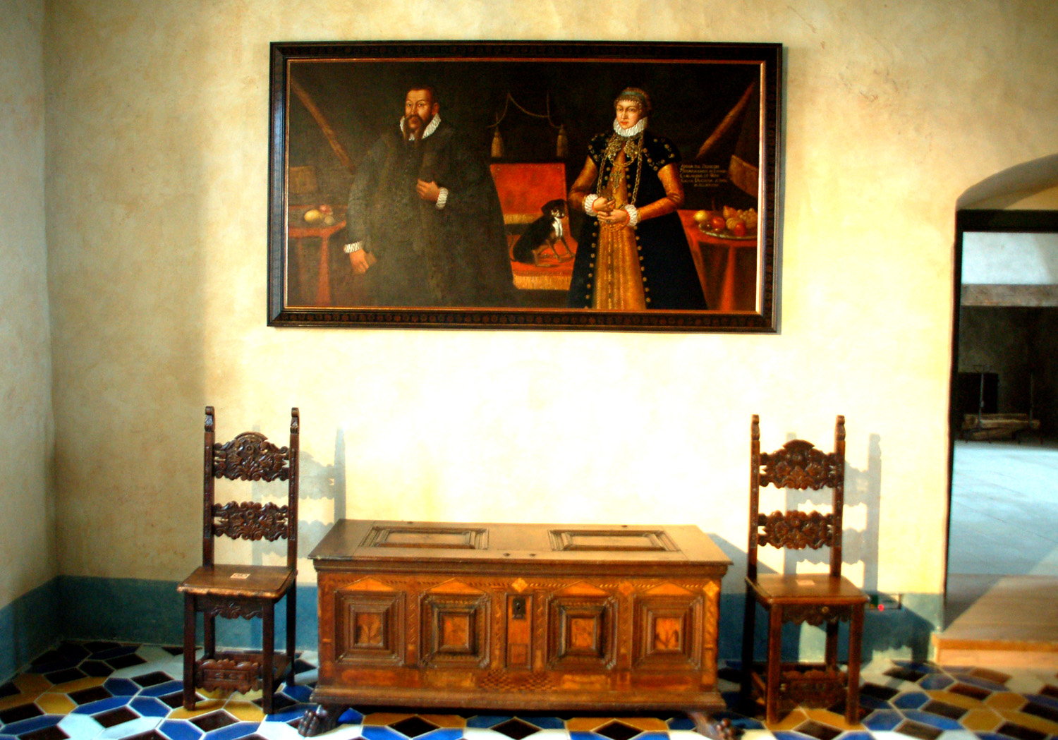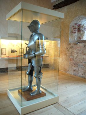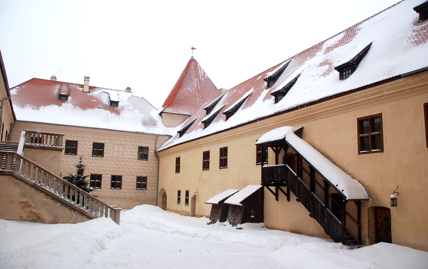 W piwnicach są kamienne kule armatnie, a w gablotach stara broń oraz różne detale z wykopalisk archeologicznych zachowane z przeszłości w imponującej liczbie 5,5 tys. Na wyższych poziomach – zamek jest piętrowy z poddaszami oraz oknami w dachach pokrytych ceglaną dachówką – stare meble, gobeliny, piękne piece kaflowe, każdy inny w poszczególnych salach, obrazy, rzeźby, replika średniowiecznej zbroi rycerskiej, ceramika artystyczna itp. Niewielką, ale ciekawą jest kolekcja dawnych strojów dworskich. Zaś na wałach ziemnych otaczających zamek stoją dwie pary średniowiecznych armat jaskrawo ocinających się na tle pokrywającego je śniegu.