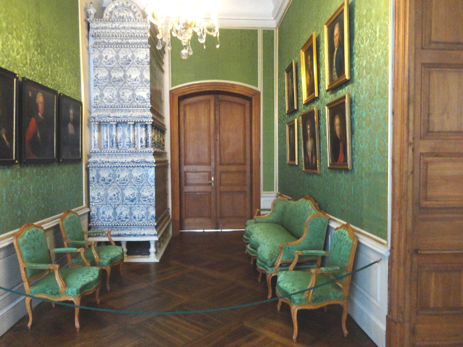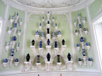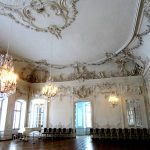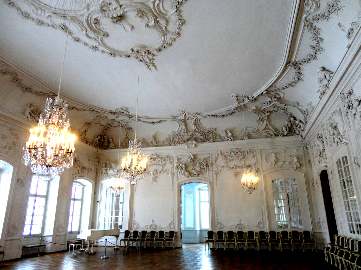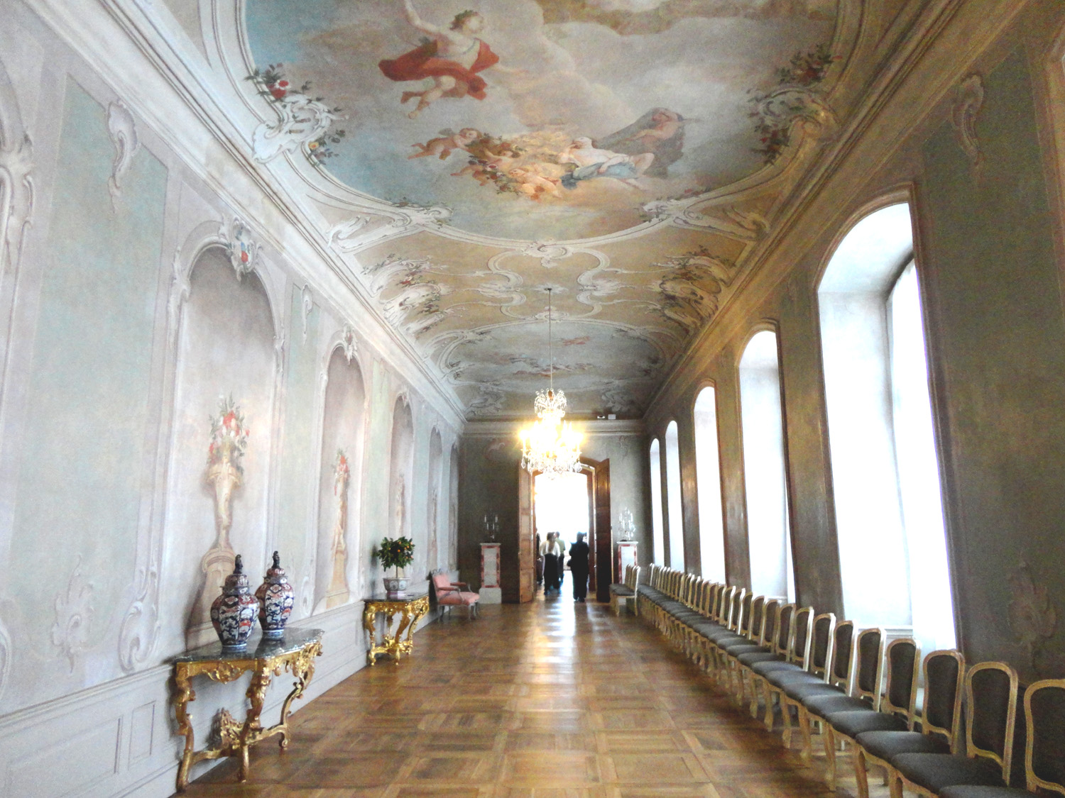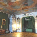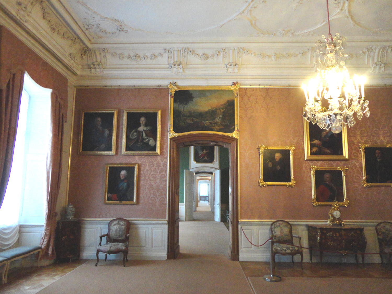 Natomiast fresk sufitowy przedstawia barokową, alegoryczną „Apoteozę księcia Ernsta Jaohanna”: Siłę, Mądrość, Prawdę i Szczodrość. Jednym z najwspanialszych dekoracyjnie jest Gabinet Porcelanowy, w którym na ścianie, na 34 stiukowych podstawkach, stoją chińskie wazony, głównie z XVIII w. Z sali tej przechodzi się do Wielkiej Galerii o długości 30 m, w której podczas świątecznych wydarzeń podejmowano przy stołach gości. Również z pięknie zdobionym stropem i ścianami oraz kryształowymi żyrandolami. Sąsiaduje z nią Biała Sala ze stropem w tym kolorze, ozdobionym kompozycjami stiukowymi: dzieci w kwiatach, bociana karmiącego pisklęta itp.