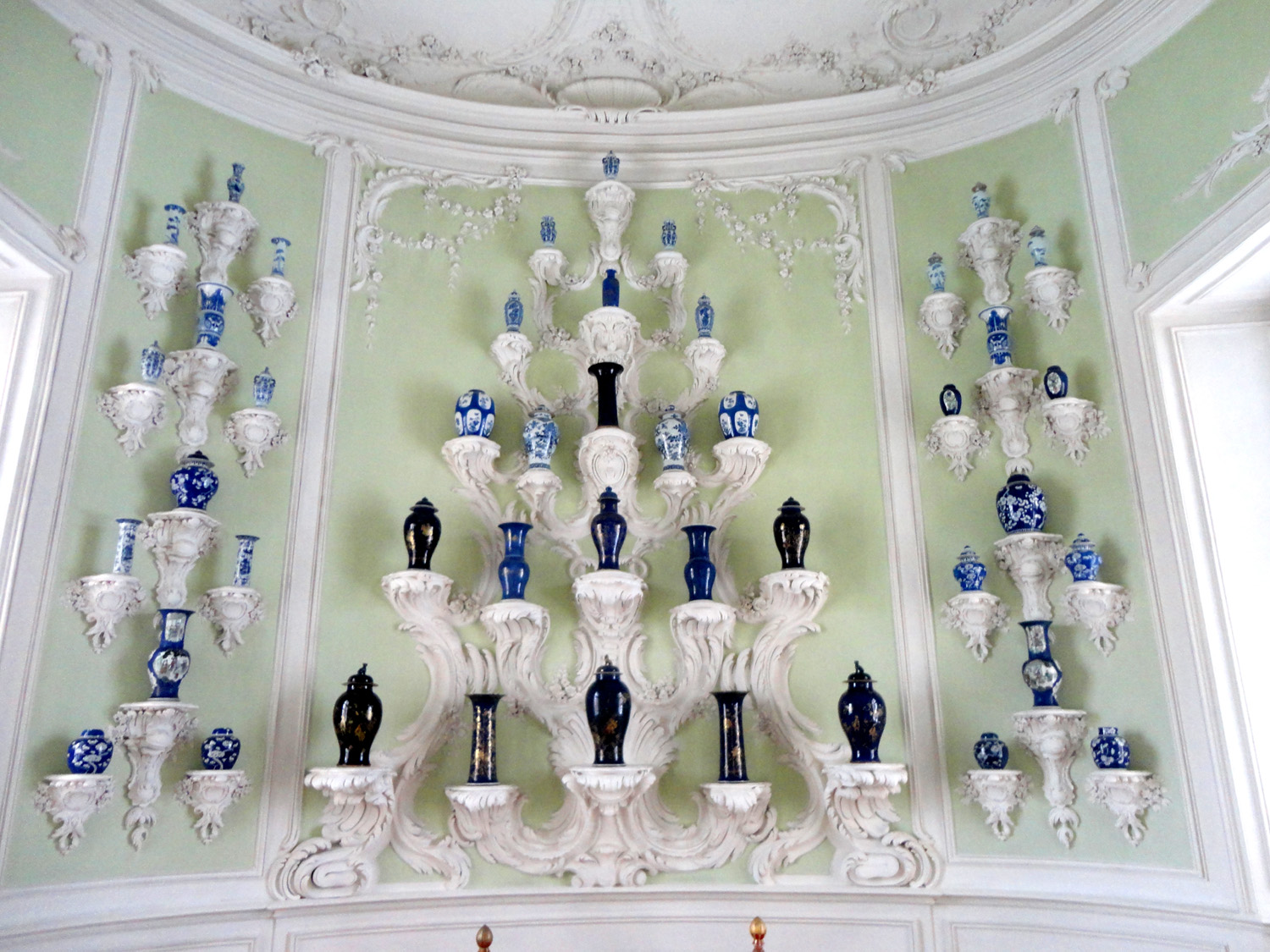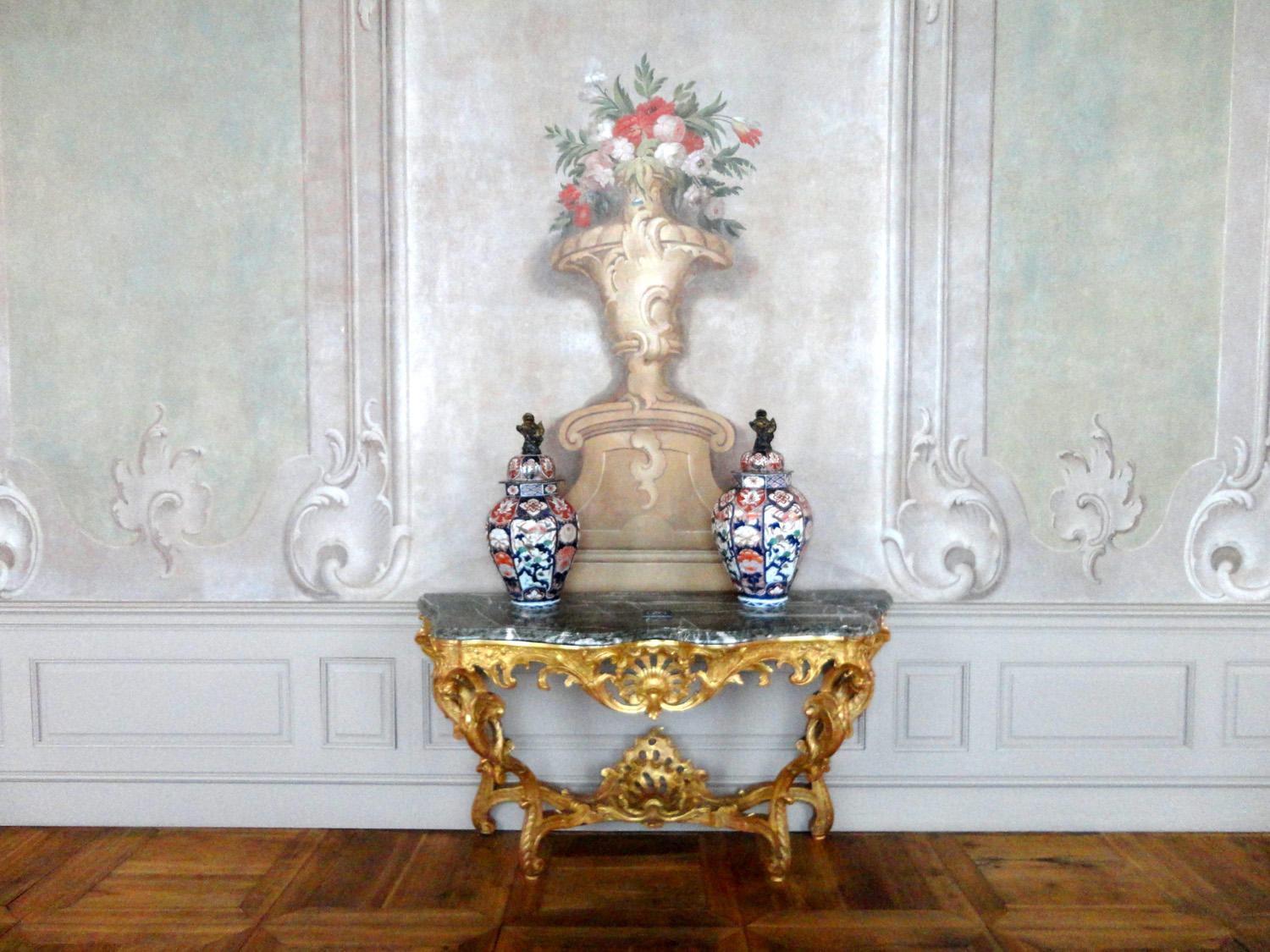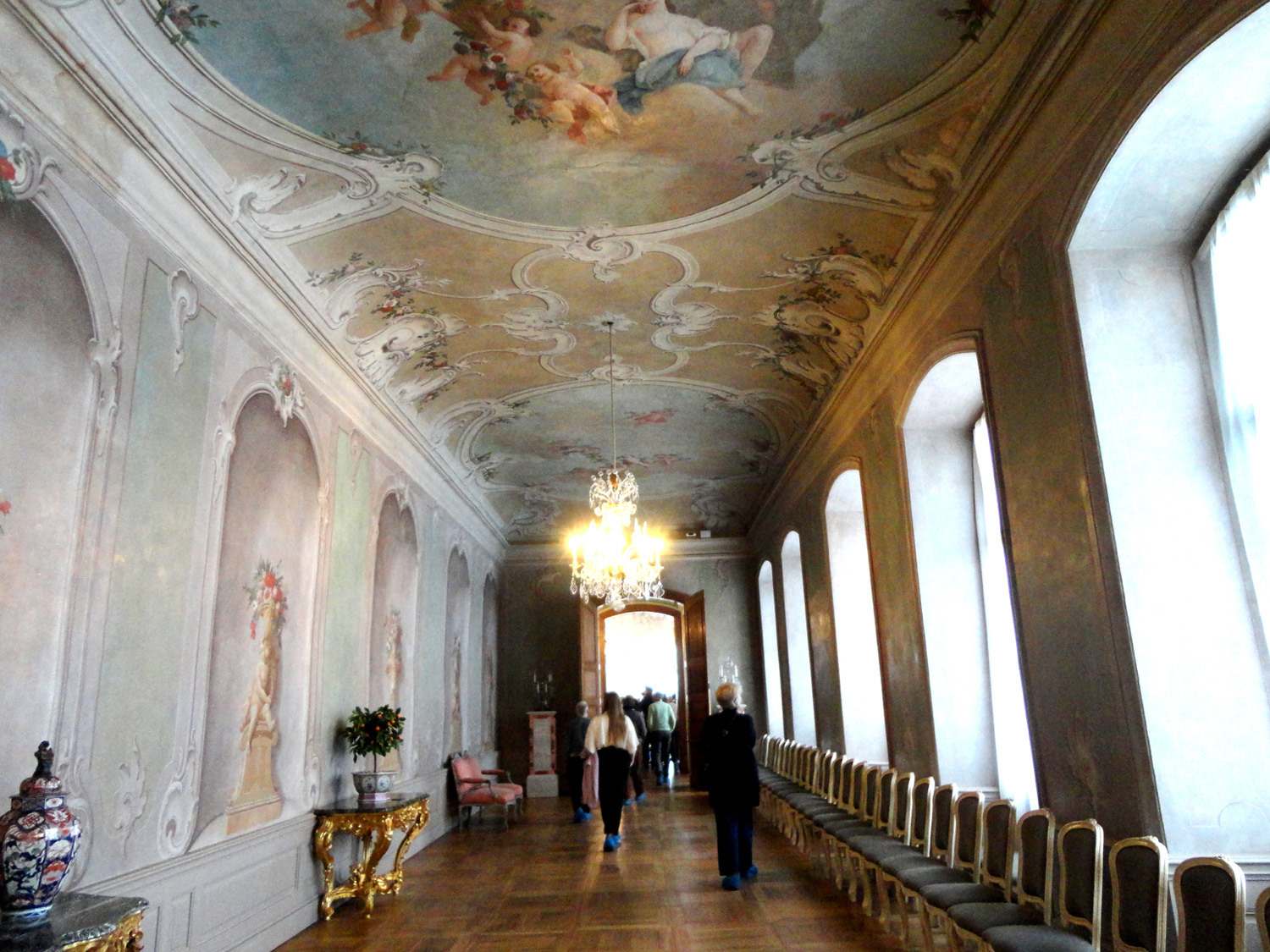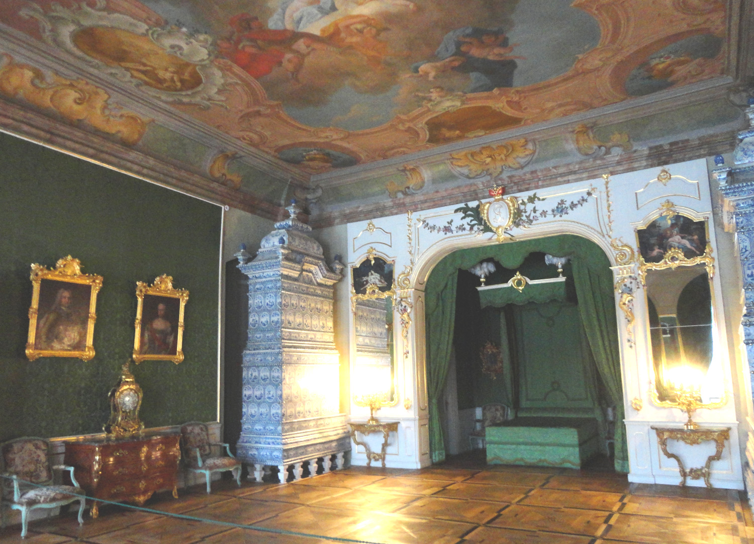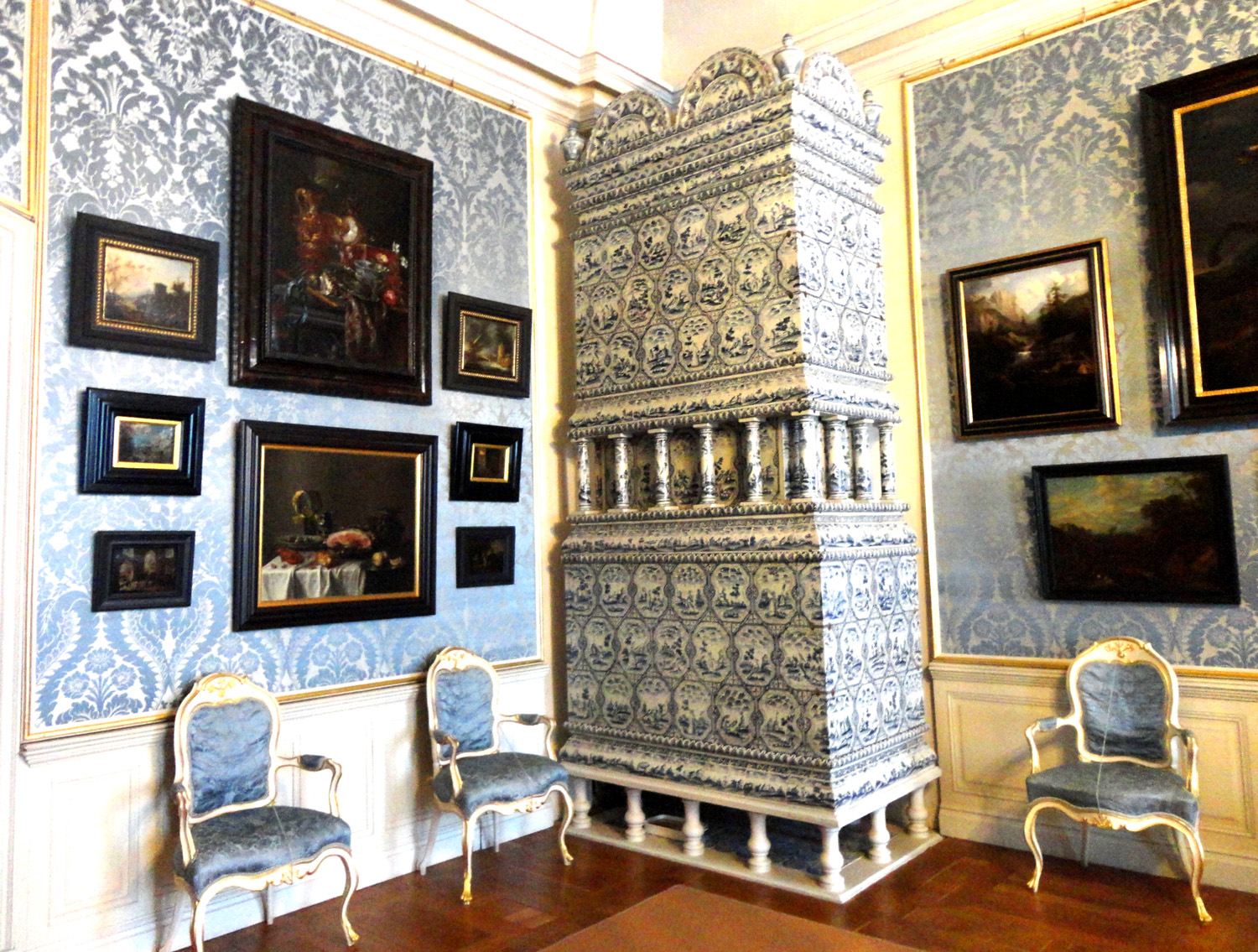 Natomiast fresk sufitowy przedstawia barokową, alegoryczną „Apoteozę księcia Ernsta Jaohanna”: Siłę, Mądrość, Prawdę i Szczodrość. Jednym z najwspanialszych dekoracyjnie jest Gabinet Porcelanowy, w którym na ścianie, na 34 stiukowych podstawkach, stoją chińskie wazony, głównie z XVIII w. Z sali tej przechodzi się do Wielkiej Galerii o długości 30 m, w której podczas świątecznych wydarzeń podejmowano przy stołach gości. Również z pięknie zdobionym stropem i ścianami oraz kryształowymi żyrandolami. Sąsiaduje z nią Biała Sala ze stropem w tym kolorze, ozdobionym kompozycjami stiukowymi: dzieci w kwiatach, bociana karmiącego pisklęta itp.