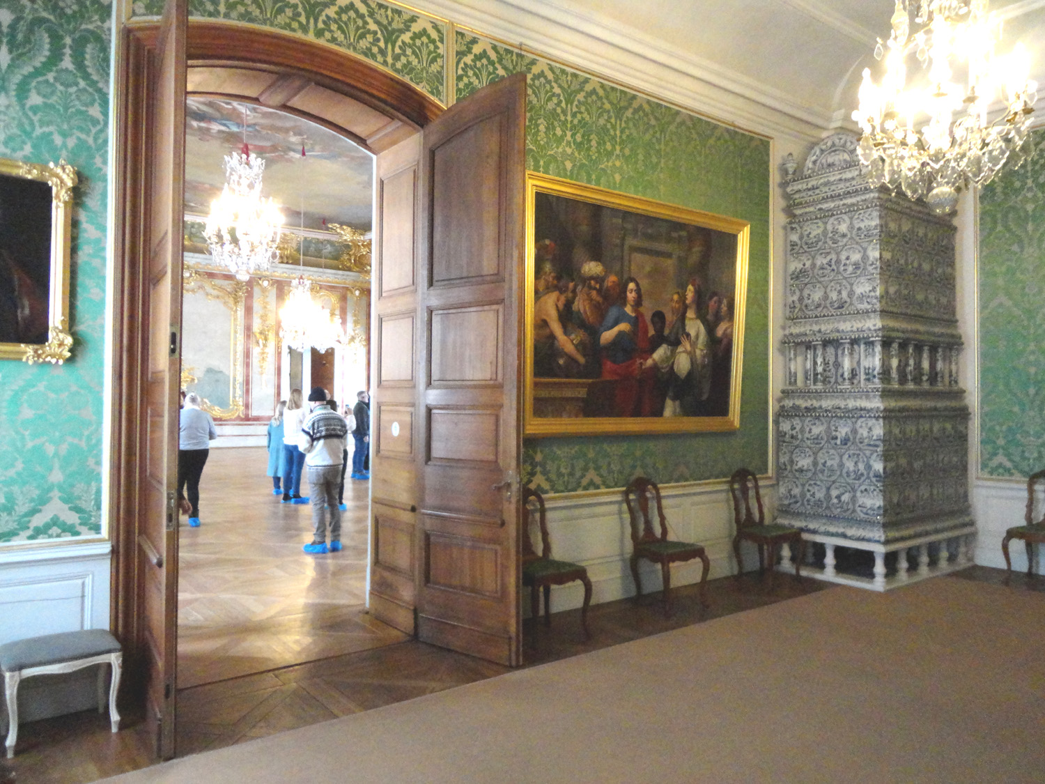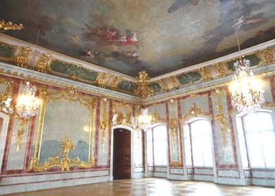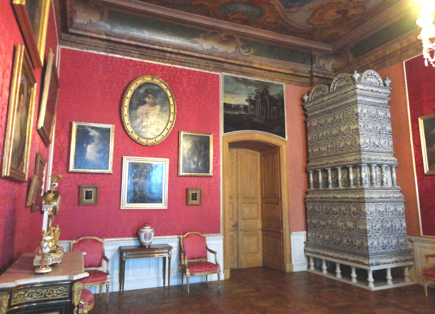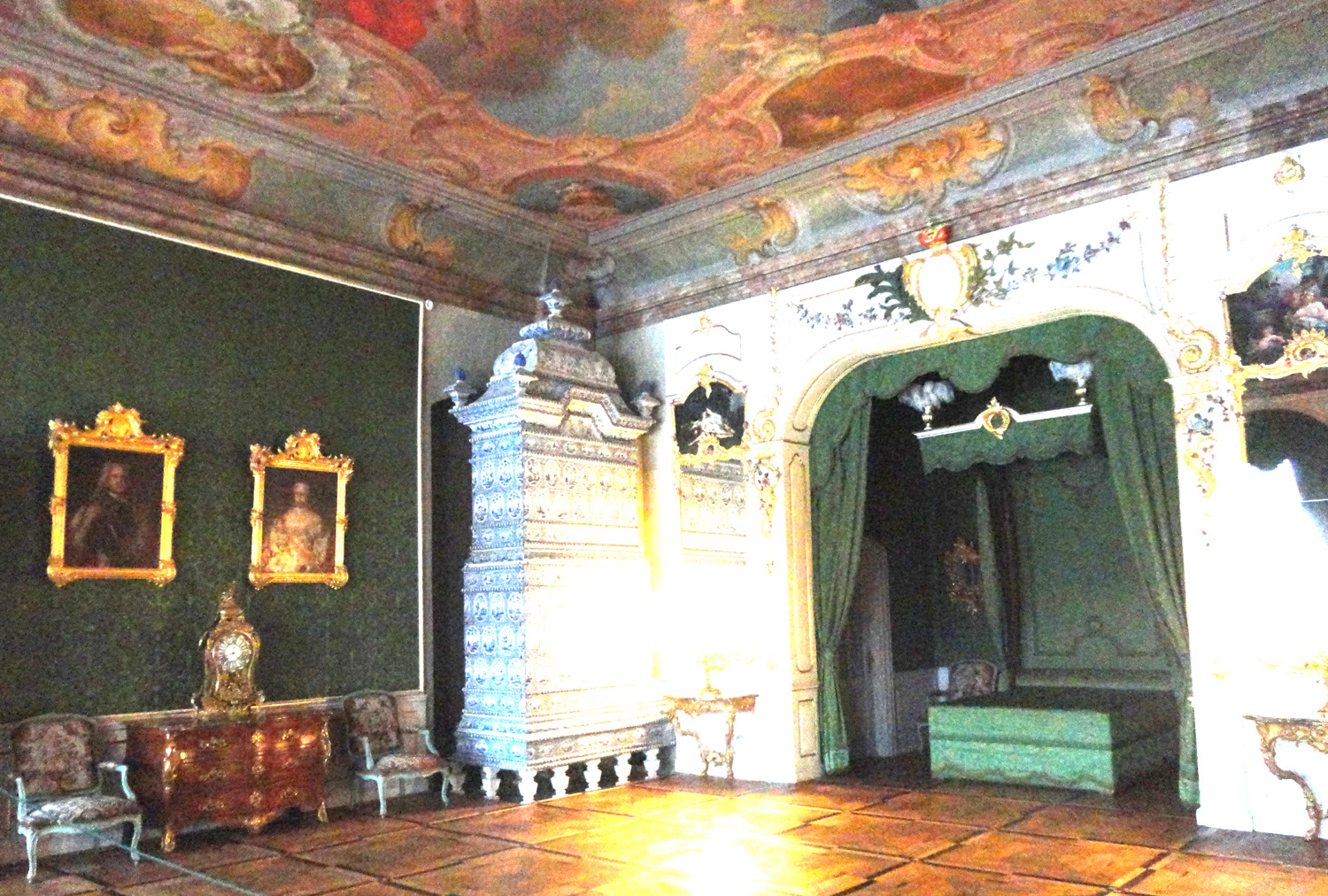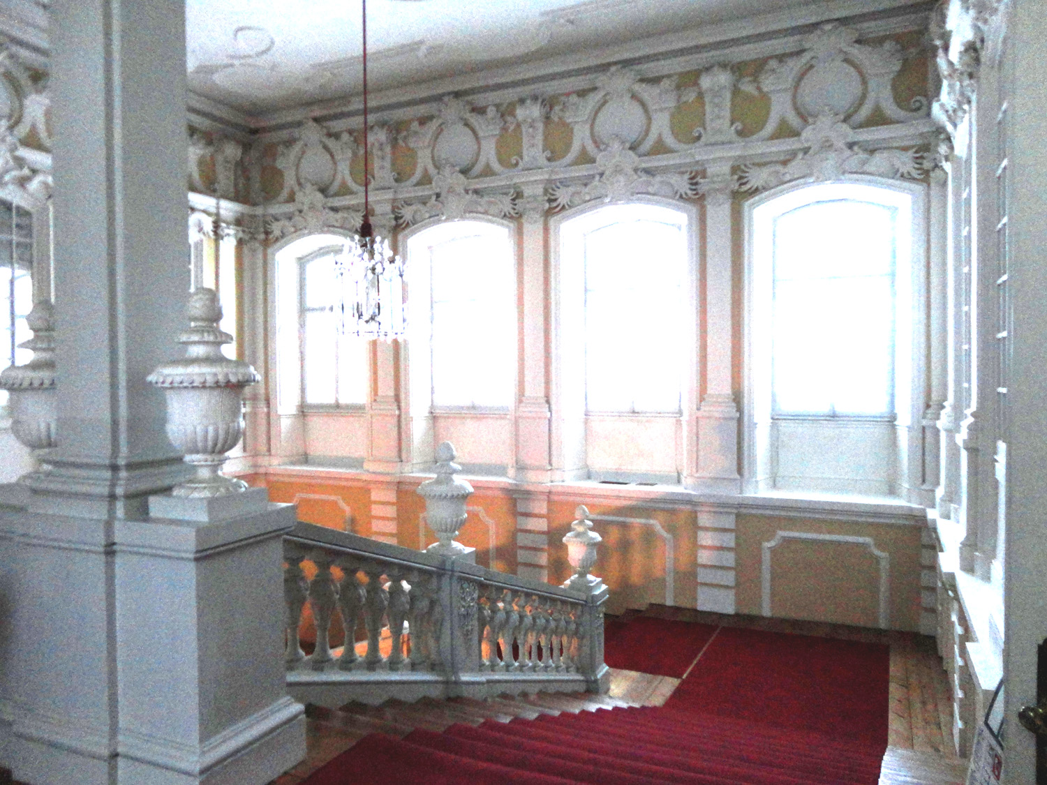 Natomiast fresk sufitowy przedstawia barokową, alegoryczną „Apoteozę księcia Ernsta Jaohanna”: Siłę, Mądrość, Prawdę i Szczodrość. Jednym z najwspanialszych dekoracyjnie jest Gabinet Porcelanowy, w którym na ścianie, na 34 stiukowych podstawkach, stoją chińskie wazony, głównie z XVIII w. Z sali tej przechodzi się do Wielkiej Galerii o długości 30 m, w której podczas świątecznych wydarzeń podejmowano przy stołach gości. Również z pięknie zdobionym stropem i ścianami oraz kryształowymi żyrandolami. Sąsiaduje z nią Biała Sala ze stropem w tym kolorze, ozdobionym kompozycjami stiukowymi: dzieci w kwiatach, bociana karmiącego pisklęta itp.
