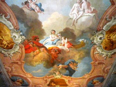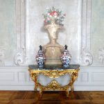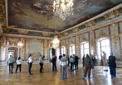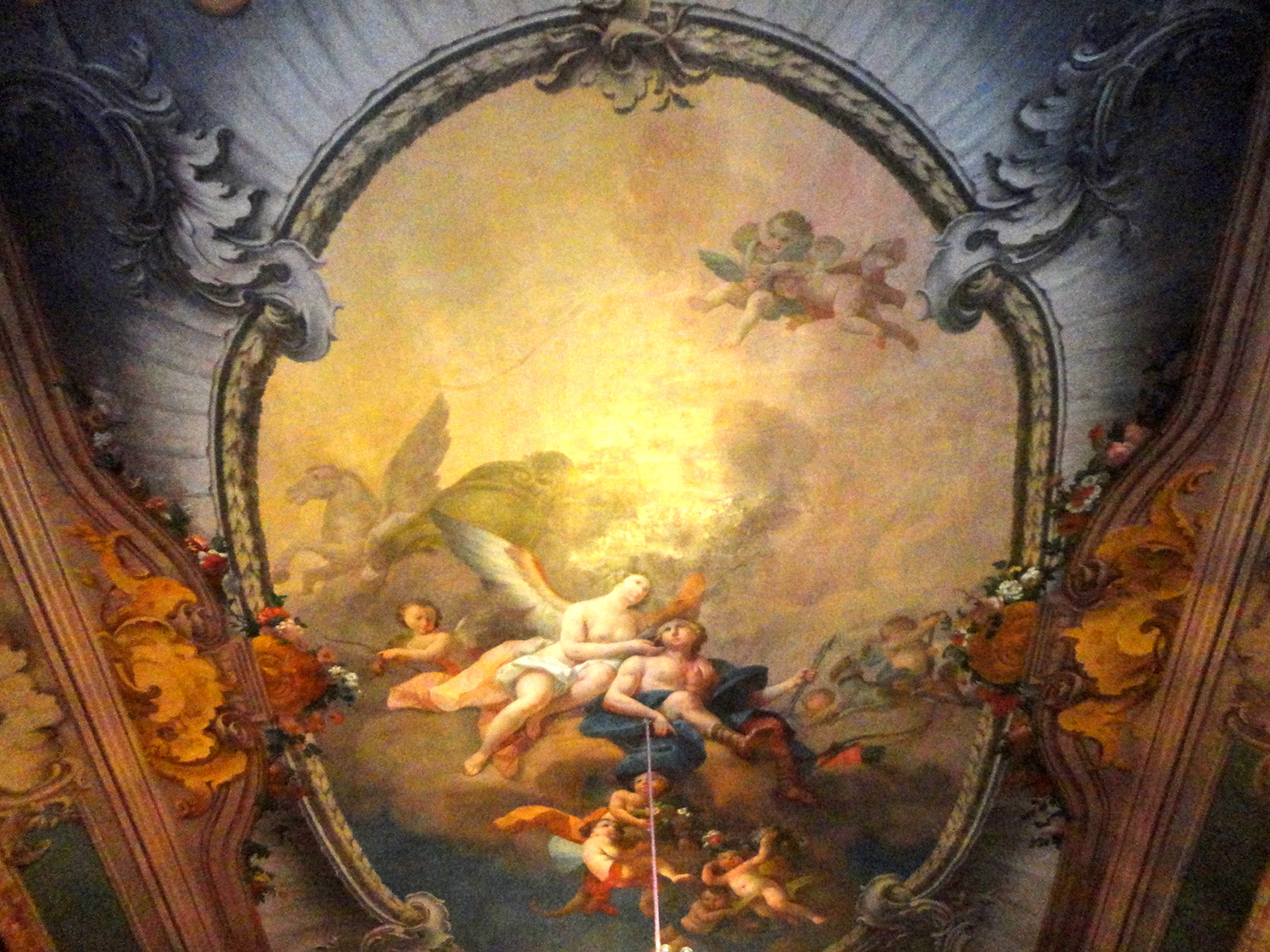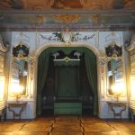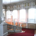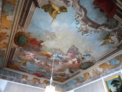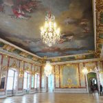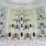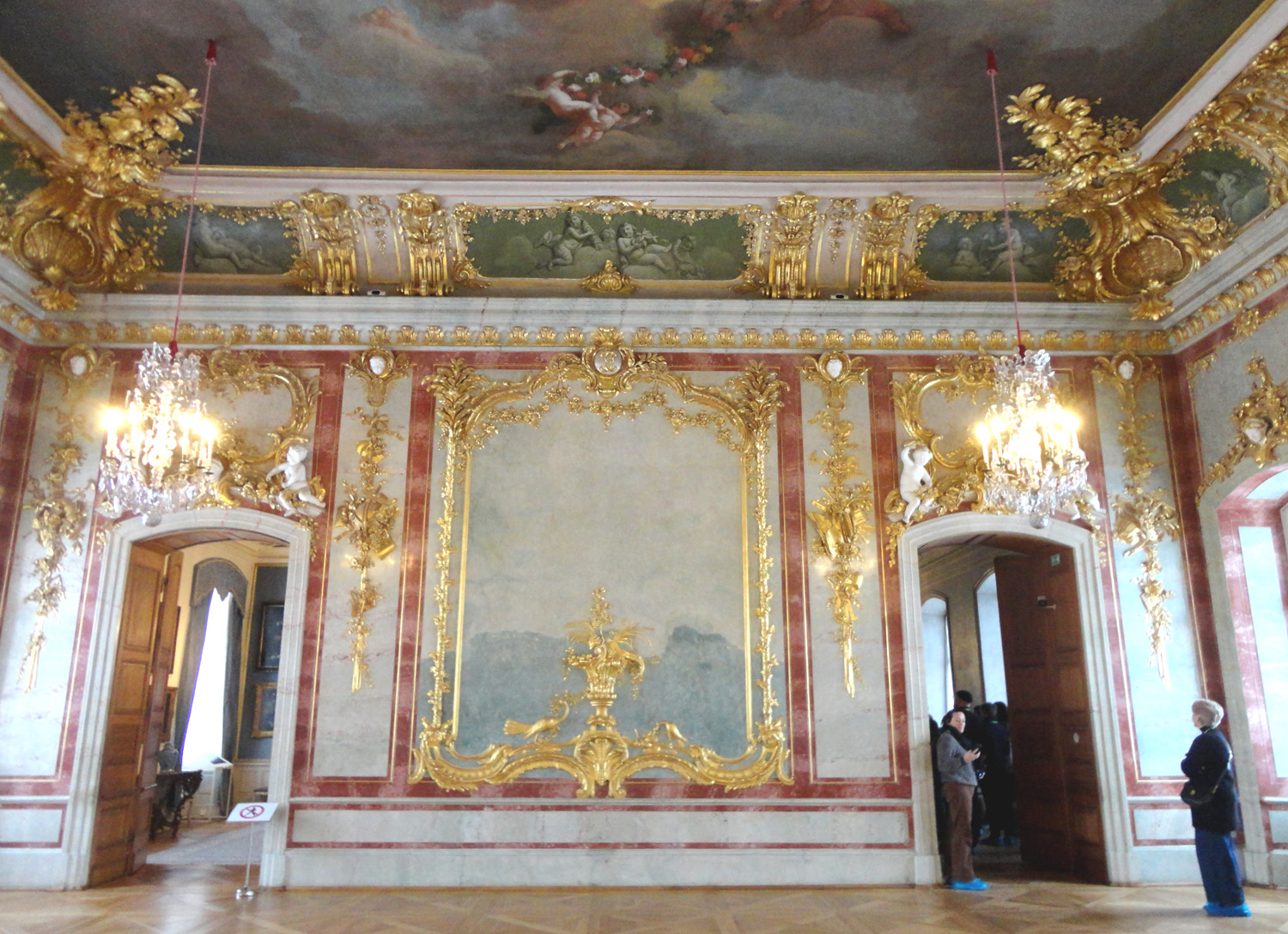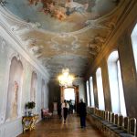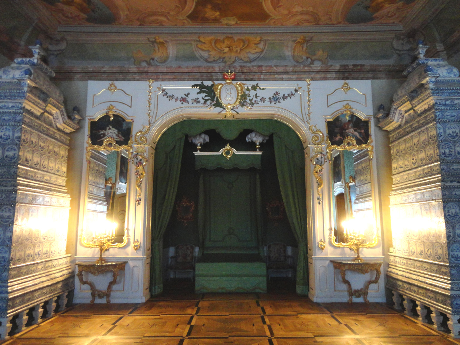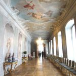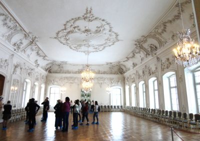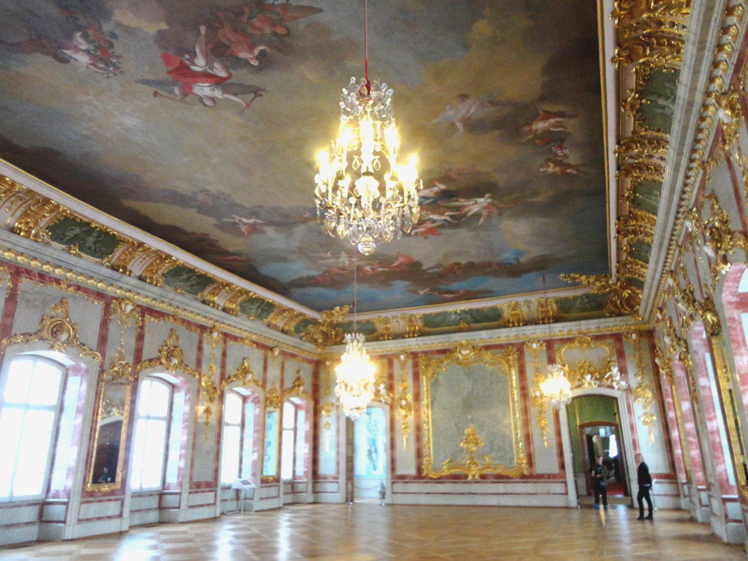 Natomiast fresk sufitowy przedstawia barokową, alegoryczną „Apoteozę księcia Ernsta Jaohanna”: Siłę, Mądrość, Prawdę i Szczodrość. Jednym z najwspanialszych dekoracyjnie jest Gabinet Porcelanowy, w którym na ścianie, na 34 stiukowych podstawkach, stoją chińskie wazony, głównie z XVIII w. Z sali tej przechodzi się do Wielkiej Galerii o długości 30 m, w której podczas świątecznych wydarzeń podejmowano przy stołach gości. Również z pięknie zdobionym stropem i ścianami oraz kryształowymi żyrandolami. Sąsiaduje z nią Biała Sala ze stropem w tym kolorze, ozdobionym kompozycjami stiukowymi: dzieci w kwiatach, bociana karmiącego pisklęta itp.