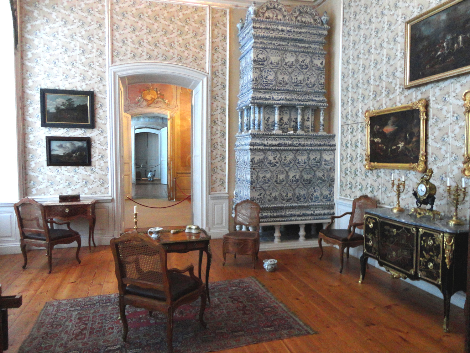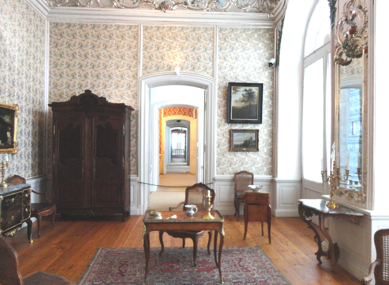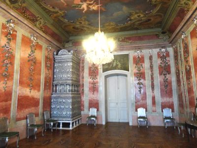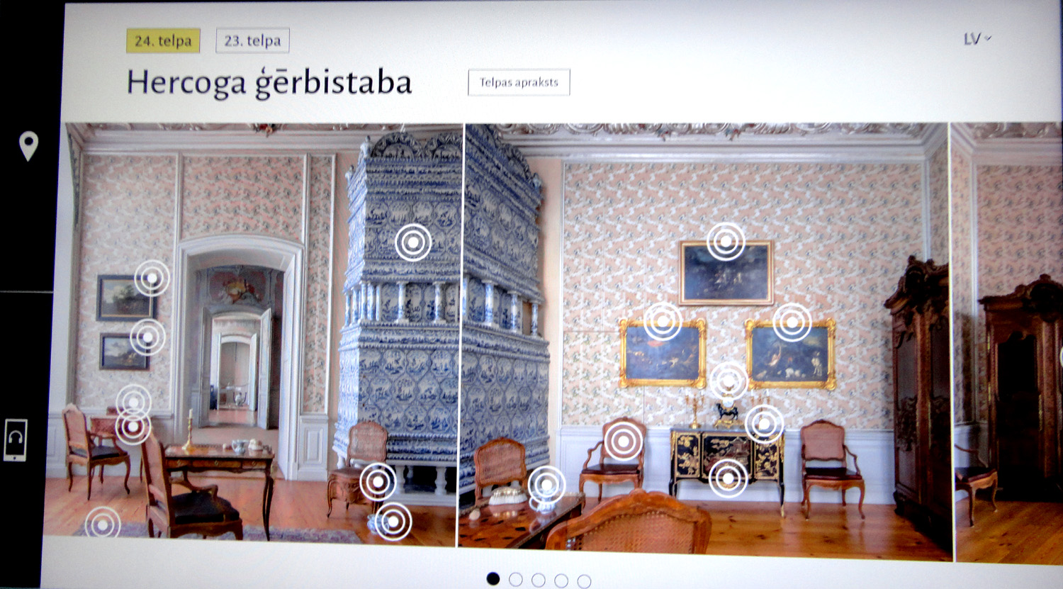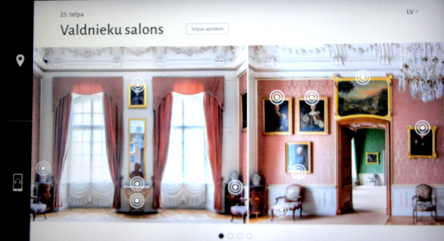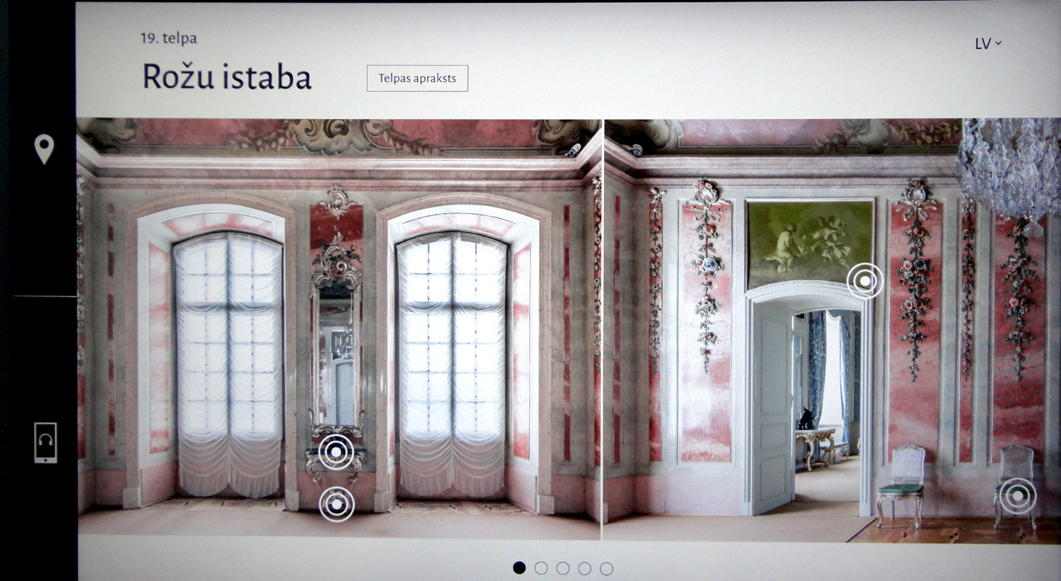 Podobnie „Pokoju Zubowych” wyposażonego w meble i inne sprzęty z czasów tych posiadaczy pałacu po 1795 roku. Oczywiście również ze zdobionym kobaltem ozdobnym piecem, obitymi jedwabiem ścianami z obrazami, meblami itp. Jedną z „perełek” jest Pokój Róż, w którym chyba najwyraźniej widać styl niemieckiego rokoko. Z alegorycznym malowidłem stropowym „Triumf Flory”, girlandami stiukowych róż na ścianach, a całość oczywiście w tonacji różowej. Sąsiadują z nim salony: „Malarstwa Niderlandzkiego” i „Władcy” z portretami przedstawicieli rodu Bironów i portrety ważnych władców w historii Księstwa Kurlandii-Zemgalii.