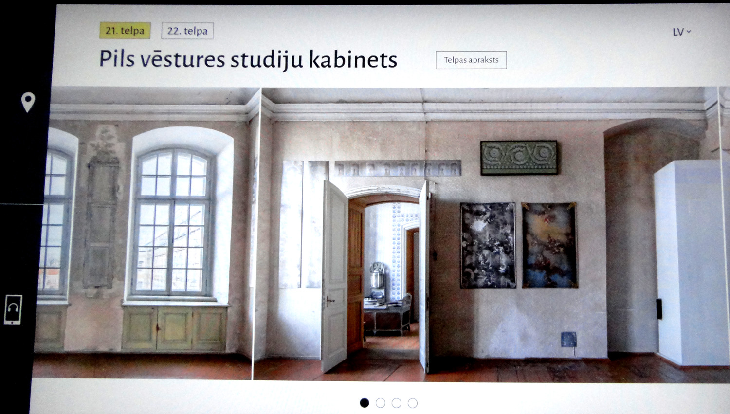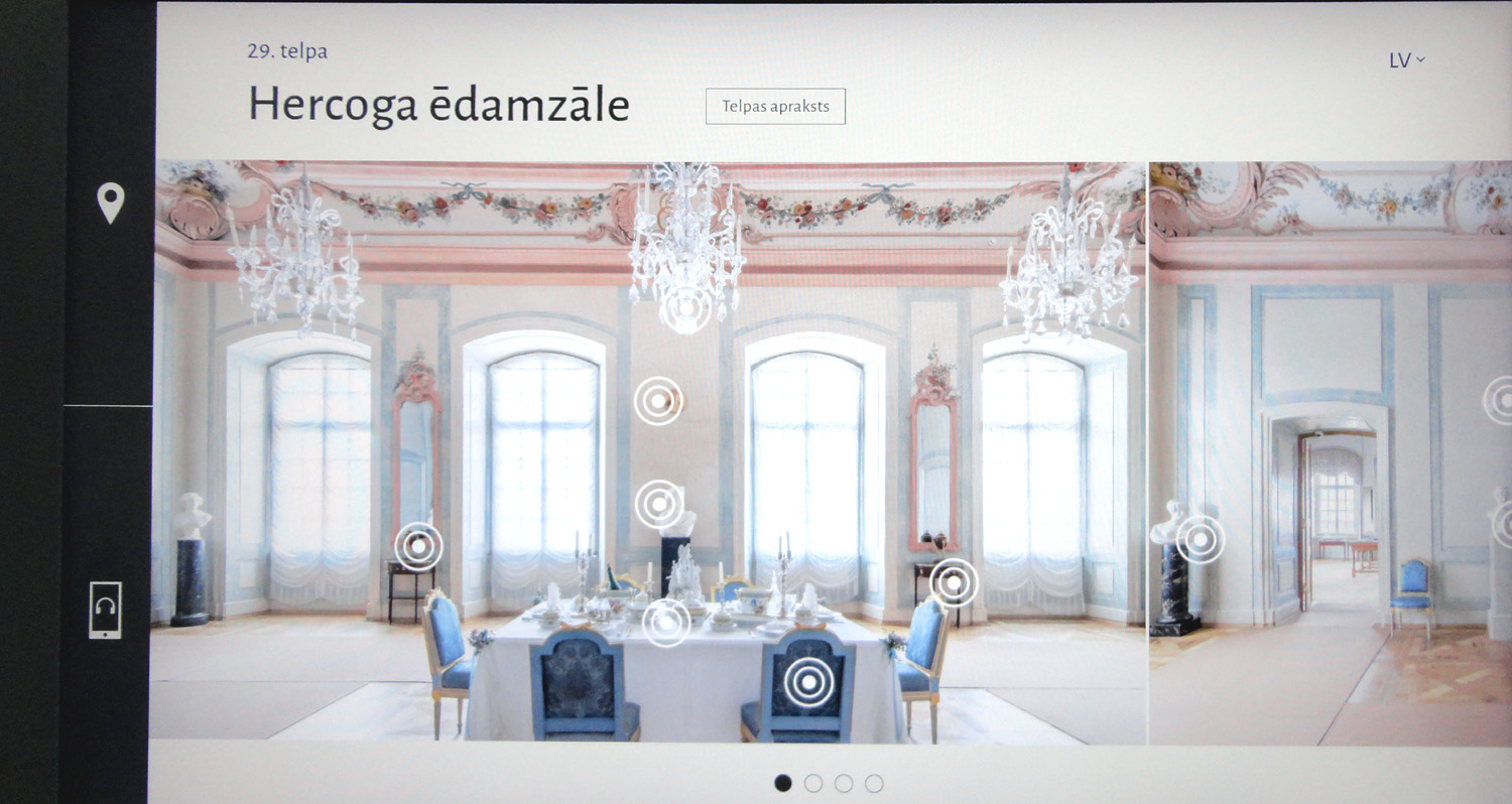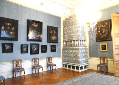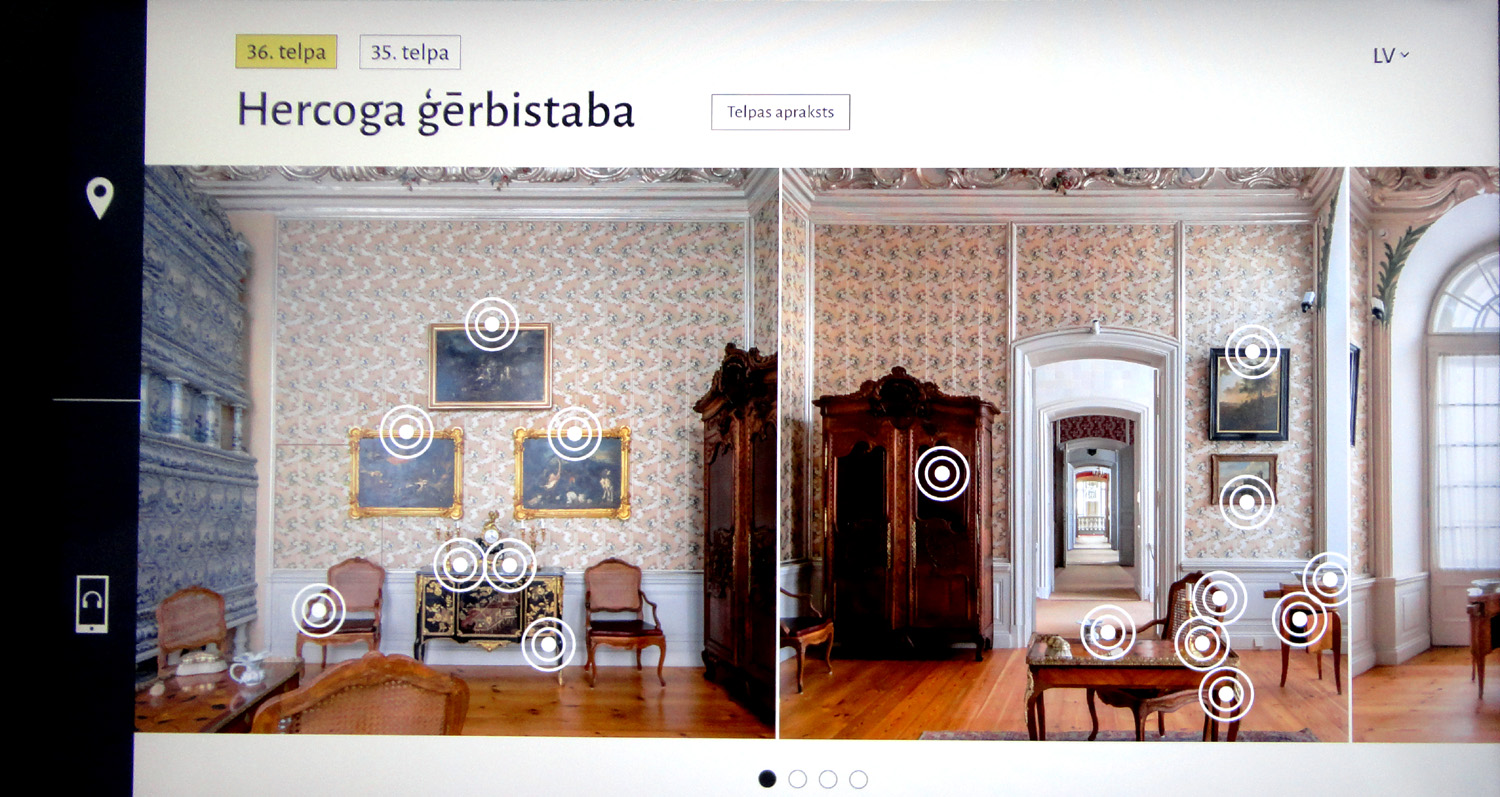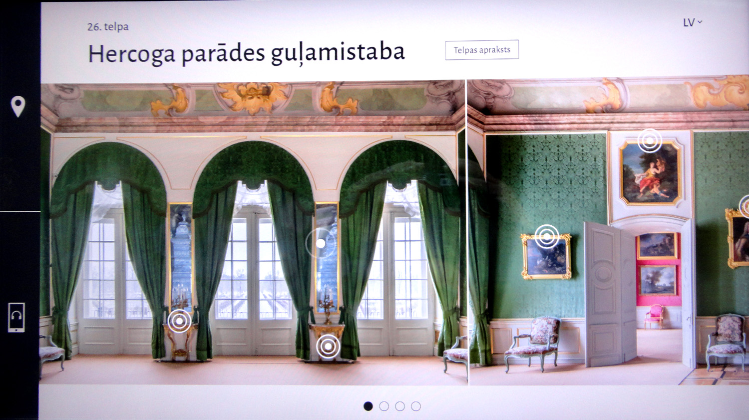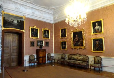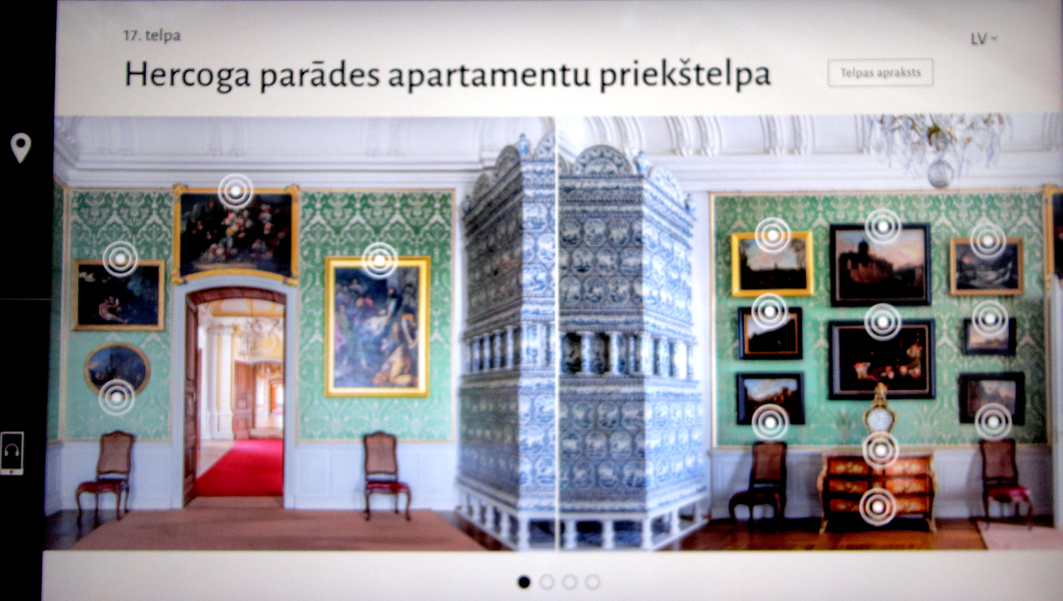 Podobnie „Pokoju Zubowych” wyposażonego w meble i inne sprzęty z czasów tych posiadaczy pałacu po 1795 roku. Oczywiście również ze zdobionym kobaltem ozdobnym piecem, obitymi jedwabiem ścianami z obrazami, meblami itp. Jedną z „perełek” jest Pokój Róż, w którym chyba najwyraźniej widać styl niemieckiego rokoko. Z alegorycznym malowidłem stropowym „Triumf Flory”, girlandami stiukowych róż na ścianach, a całość oczywiście w tonacji różowej. Sąsiadują z nim salony: „Malarstwa Niderlandzkiego” i „Władcy” z portretami przedstawicieli rodu Bironów i portrety ważnych władców w historii Księstwa Kurlandii-Zemgalii.