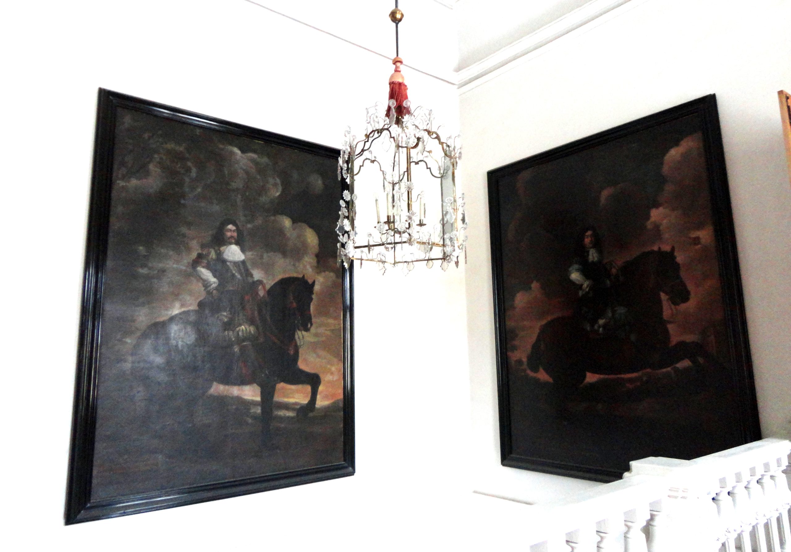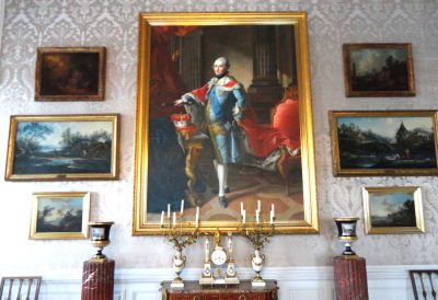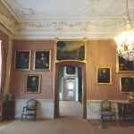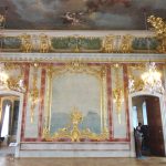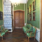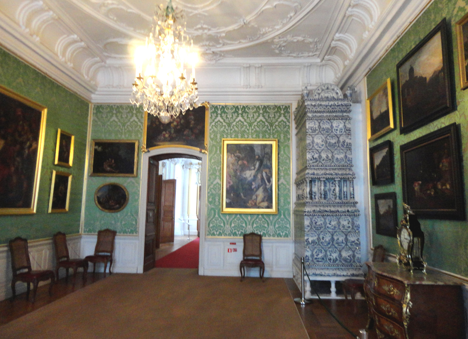Imponujące są centralne schody prowadzące od wejścia na górę do rozległego westybulu. Zachowane, co tu się podkreśla, według początkowego stanu sprzed już niemal 300 lat. Ciąg sal paradnych otwiera Mały Przedpokój, w którym, poza pięknym, zielonym, wzorzystym obiciem ścian z umieszczonych na nich obrazami, uwagę przyciąga ogromny, niemal do sufitu, piec kaflowy zdobiony błękitną majoliką. Jest to jedna z 20 kopii dawnych pałacowych pieców wykonanych jako uzupełnienie 8 starych, zachowanych. Ponadto stoją w nim krzesła , stolik oraz ceramika z XVIII w. Sąsiaduje z nim Złota Sala, która nazwę zawdzięcza pozłacanym dekoracjom wykonanym przez Johanna Grafa, m.in. złotym girlandom na ścianach.