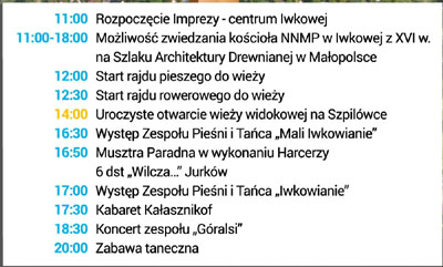 Warto tu zawędrować w poszukiwaniu malowniczych widoków oraz, by skorzystać z innych przygotowanych na ten dzień atrakcji. Najlepsze widoki na lato tylko ze Szpilówki! Wieża widokowa na Szpilówce zostanie uroczyście otwarta o godzinie 14:00. Można dostać się tam pieszo lub rowerem. Rajd pieszy wyruszy z placu w centrum Iwkowej w samo południe, rajd rowerowy – pół godziny później. Przekonajmy się wspólnie, kto pierwszy dotrze na położone 516 m n.p.m wzniesienie Pogórza Wiśnickiego. Piękne widoki i pamiątkowy upominek wynagrodzą trud wejścia na szczyt. Wieża na Szpilówce położona jest na Szlaku Wież Widokowych Pogórza, a przez samą Iwkową przebiega Szlak Suszonej Śliwki, ale i Szlak Architektury Drewnianej. Od 11:00 do 18:00 będą dla Was otwarte drzwi drewnianego kościoła p.w. Nawiedzenia NMP z XVI wieku.
