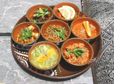 Równie wysokiej klasy okazały się restauracje, w których serwowano nam obiady i kolacje. Z ogromnym wyborem dań znakomitej kuchni marokańskiej. Stanowi ona połączenie mauretańskiej, europejskiej i śródziemnomorskiej, z mnóstwem przypraw, znakomitymi rybami i innymi owocami morza, warzyw i owoców, z mięs głównie baraniną, jagnięciną i wołowiną oraz nieśmiertelnymi kurczakami, chociaż również indykami. No i dobrymi winami, chociaż ich, podobnie jak mocniejszych alkoholi, muzułmanie oczywiście nie piją. Pozostali mają, nie wszędzie, do wyboru zagraniczne trunki wysokoprocentowe oraz piwo. Wyjątkowo zresztą drogie. Najtańsze miejscowe, w restauracjach w których jadaliśmy, były w cenie 100 dirhamów (10 €) za butelkę 0,3 litra.