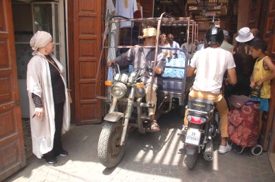 O ile podczas moich poprzednich tu pobytów zaopatrzenie sklepów i stoisk w wąskich uliczkach i zaułkach odbywało się na osiołkach, lub wózkami ciągniętymi przez małe koniki, rzadziej niewielkie samochody dostawcze. A tubylcy poruszali się pieszo. Obecnie „królują” skutery i motocykle, na które przesiedli się mniej zamożni mieszkańcy. Chociaż na rowerach trafia się ich również sporo, pomimo wyraźnych zakazów wjeżdżania nimi na suki. A zmotoryzowani po prostu szaleją, starając się wymijać pieszych i, także jadące z naprzeciwka motory i inne pojazdy. Dochodzi więc do zatorów, blokad i konfliktów na tym tle.