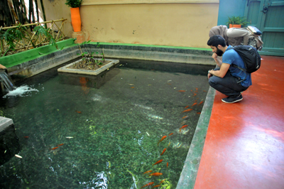W jednej sadzawce otoczonej papirusami rosną lilie wodne, w trochę większym baseniku wodnym pływają złote rybki.