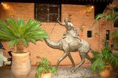 Na końcu jednego z zaułków, przy czym ten historyczny riad ma wysokie ceglane ściany z ozdobnym wejściem oraz niewielkimi oknami z kutymi ozdobnie metalowymi kratami na wysokości piętra oraz widocznym z dołu oszklonym tarasem na dachu. Tuż przed wejściem między palmami stoi niemal naturalnej wielkości brązowa rzeźba wielbłąda z wojownikiem na jego grzbiecie.
