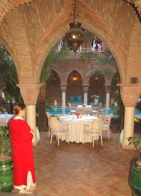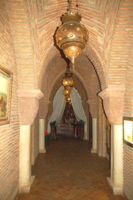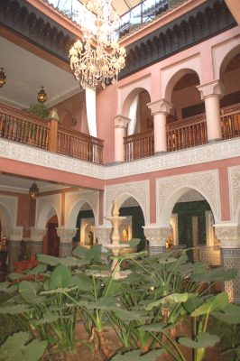 Po wejściu do tego hotelu goście znajdują się od razu w przypominającym zamkowy korytarzu. O mauretańskim, tak bardzo bliskim europejskiemu gotykowi kształcie, z kolumnami z kapitelami oraz ścianami i stropami wyłożonymi cegłami oraz zwisającymi z nich dużymi, bogato zdobionymi kolorowymi kamieniami i szkłem, metalowymi lampami. A z niego przechodzimy do sali restauracyjnej, witani przez obsługę. Mieści się ona w centralnym patio pod odkrytym niebem z dwupoziomowymi podcieniami i arkadami. Przed rzadkimi tu opadami, konsumentów chronią stropy podcieni.