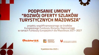 Jest to rekordowa pod względem wysokości kwota, a umowę dotyczącą projektu „Rozwój oferty szlaków turystycznych Mazowsza” współfinansowanego ze środków Europejskiego Funduszu Rozwoju Regionalnego w ramach Funduszy Europejskich dla Mazowsza na lata 2021-2027 podpisali w trakcie konferencji prasowej 9 października Wiesław Raboszuk – wicemarszałek Województwa Mazowieckiego, Izabela Stelmańska – prezeska Mazowieckiej Regionalnej Organizacji Turystycznej i Jarosław Jóźwiak – członek Zarządu MROT. Pieniądze te przeznaczone zostaną na zmodernizowanie systemów oznakowania pięciu szlaków turystycznych: