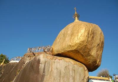 Złotą Skałę Kyaikhtiyo ze stojącą na niej niewielką pagodą, która stanowi dla uczonych zagadkę w jaki sposób od stuleci utrzymuje się ona nad przepaścią. Otoczona zabudowaniami klasztoru oraz innymi budowlami sanktuarium – jednego z najważniejszych miejsc pielgrzymkowych w kraju.