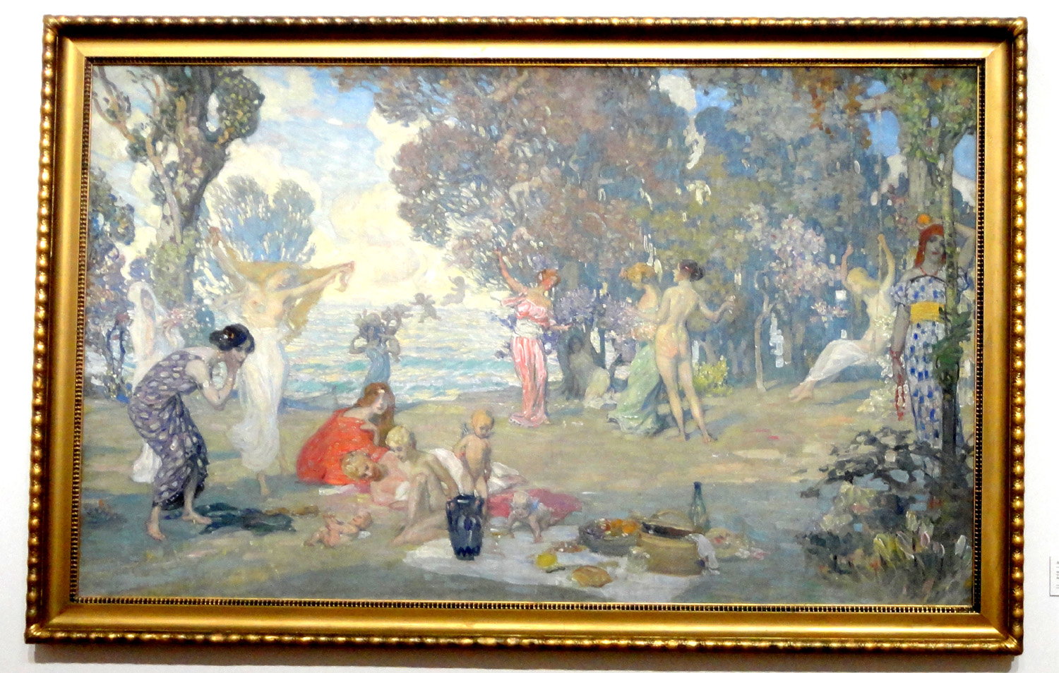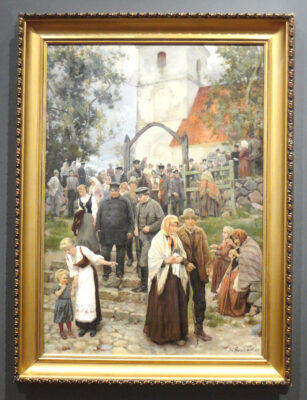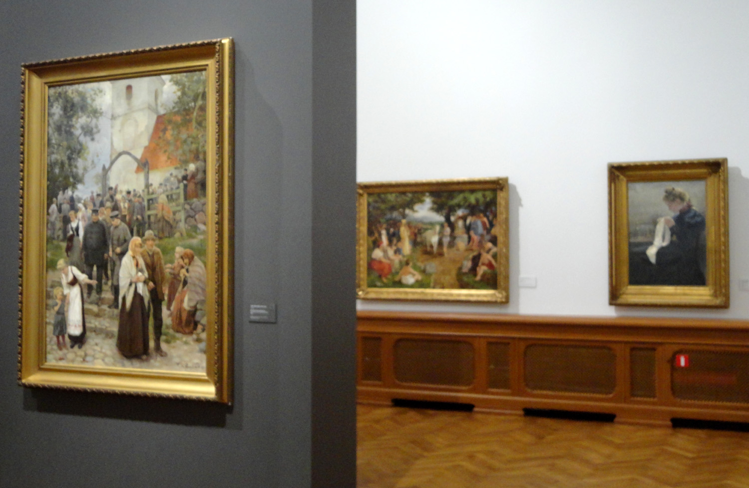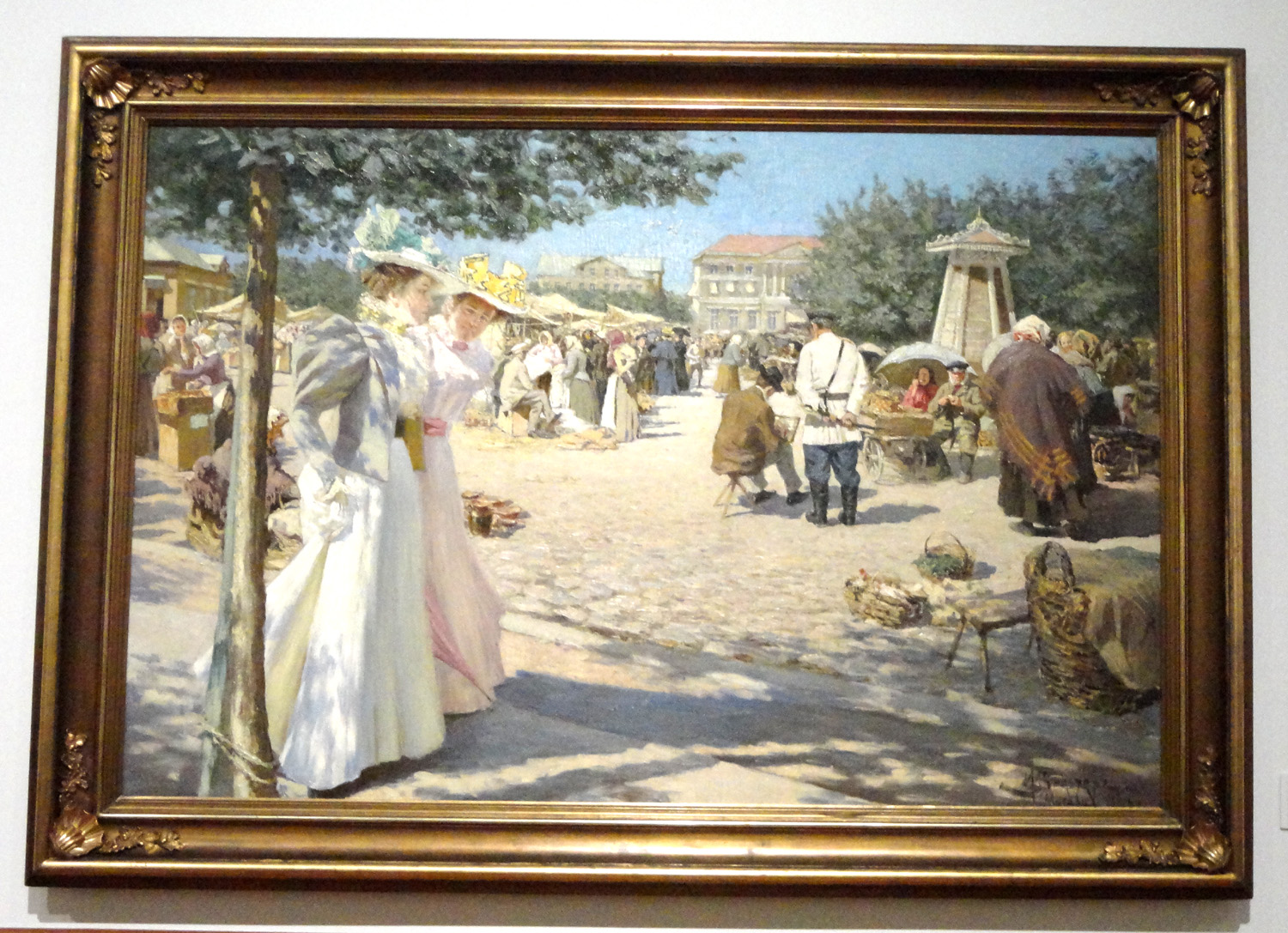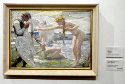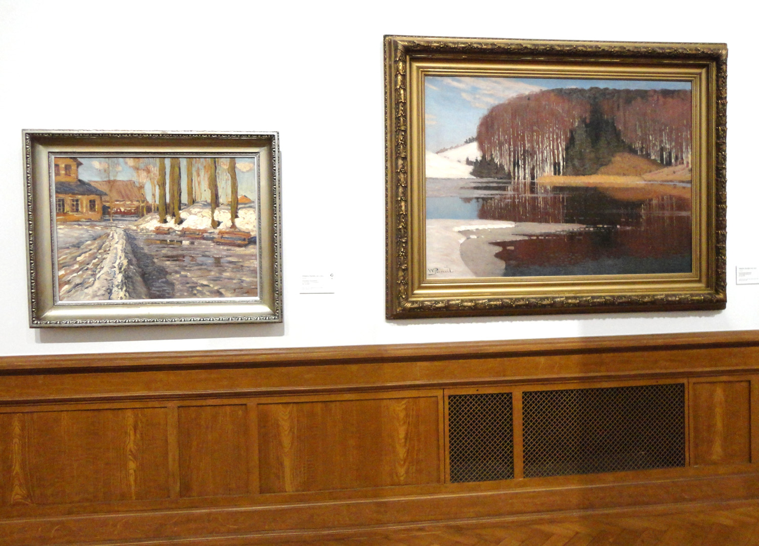 Od przełomu wieków XIX i XX oraz z lat 20 i 30-tych, modnych wówczas kierunków zwłaszcza nad Sekwaną. Zaś w pejzażach artystów rosyjskich, m.in. Isaaka Lewitana (1860–1900) i Archipa Kuindży’ego (1842–1910). Ale to mogą być tylko moje odczucia, nie zaś stwierdzenia historyka sztuki. Jeżeli chodzi o tematykę, to w ekspozycji mnóstwo jest portretów, szczególnie kobiecych, chociaż mnie „nie powalających” artyzmem. Podobało mi się natomiast sporo pejzaży, a także, stosunkowo nielicznych, scen rodzajowych, czy wyjątkowych biblijnych. Z przyjemnością oglądałem m.in. scenę kąpieli Janisa Rozentalsa (1866-1936) nawiązującą chyba do mitu Ledy i Zeusa pod postacią łabędzia.