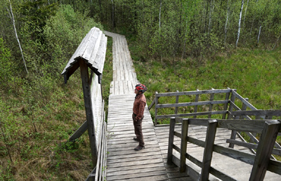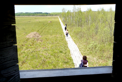 Dalej znów przez przybrzeżną strefę szuwarów i znów przez bagienny las. Na drugim brzegu stoi czatownia – wieża widokowa, umożliwiająca obserwacje zwierząt, a zwłaszcza ptaków, którymi słynie Biebrzański Park Narodowy, zwłaszcza w czasach sezonowych migracji. Dalej są niewielki podest widokowy i wiata przy niewielkim parkingu. Tu jest koniec trasy.