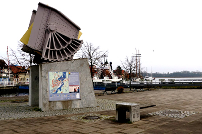 Most ten jednak zburzyli Niemcy w 1945 roku uciekając przed nacierającą Armią Czerwoną. Odbudowano go w 1950 r. ale w latach 90 był już mocno wyeksploatowany, więc zastąpiono go nowym. Pamiątkowy kawałek jego konstrukcji zdobią słup z informacjami turystycznymi stojący na placu portowym.