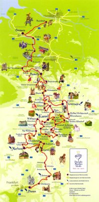 A głównymi tematami są, jak już wspomniałem, 275 rocznica śmierci Jana Sebastiana Bacha i 50-cio lecie Niemieckiego Szlaku Baśni (Deutsche Märchenstrasse) i grą „Żabi Król z papieru”, także w polskiej wersji językowej oraz propozycjami podróży do miejsc związanych z baśniami Braci Grimm. Natomiast ten Szlak, którego mapkę publikujemy, rozpoczyna się w Hanau – miejscowości urodzin obu braci i prowadzi przez Steinau („Żabi Król”), Alsfeld („Czerwony Kapturek”), Trendelburg („Roszpunka”), Hameln („Szczurołap”) do Bremy („Muzykanci z Bremy”).