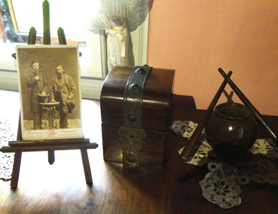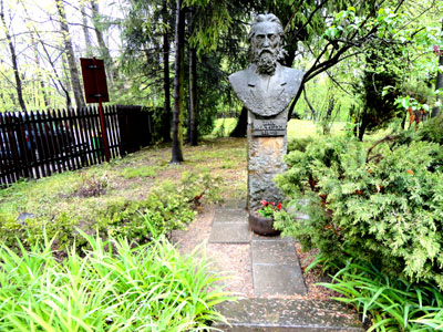 Zachował się oryginał tego podwójnego portretu z podpisami na odwrocie przedstawionych na nim panów, które demonstruje nam p. Maria, a my fotografujemy. Zaraz za wejściem na posesję stoi po lewej stonie, wśród zieleni, popiersie Jana Matejki. A za dworkiem pomieszczenia gospodarcze. Jest więc co oglądać i czego dowiedzieć się w Koryznowce.