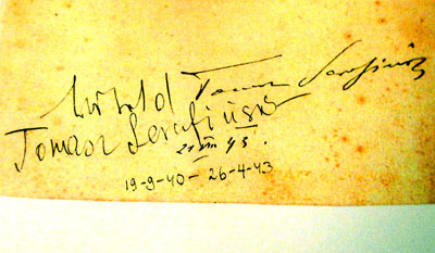 A znajomy grafik narysował wówczas węglem profilowy portret obu. Podpisując go i datując: 24.VII.43. Na jego odwrocie podpisali się obaj panowie Tomasze Serafińscy. Rotmistrz poprzedzając swoim prawdziwym imieniem Witold. Zaś gospodarz dodając datę: 21.VIII.43. Poniżej znajdują się również daty: 19-9-40 – 26-4-43.