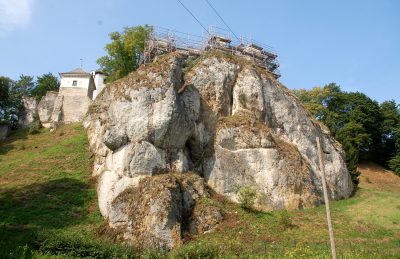 Pierwotnie znajdowały się one w kaplicy rodowej w Brzeżanach na Podolu, obecnie w Ukrainie, ale wywiezione zostały do Krakowa w 1920 r. podczas wojny z bolszewikami. Na szczęście, bo tamtejszy kościół i kaplica zostały po 1945 r. kompletnie zdewastowane. Ten piękny zamek położony na zboczu góry świetnie jest widoczny z przebiegającej poniżej niego drogi. W pobliżu stoi przy niej również słynna Maczuga Herkulesa, a jak potrafi się znaleźć odpowiednie miejsce, to na jednym zdjęciu, które publikuję, można ująć zarówno ją jak i zamek.