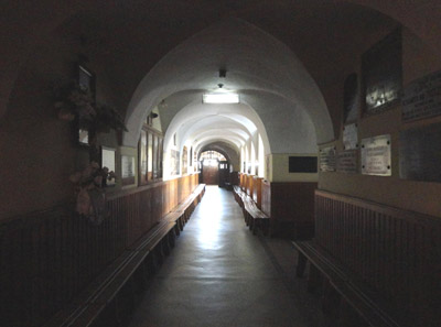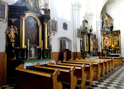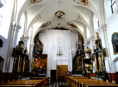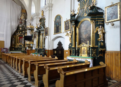 W kruchcie dolnej kondygnacji wieży jest natomiast krucyfiks z XVIII w. Prowadzi z niej także dosyć ciemny, sklepiony korytarz do klasztoru, zbudowanego na planie czworoboku z wewnętrznym wirydarzem. Nawa główna kościoła przedzielona jest obecnie na wysokości prezbiterium rusztowaniami dobiegającego końca remontu tak, że ołtarz główny z Ukrzyżowanym jest chwilowo niewidoczny i niedostępny.