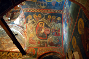 Chociaż zdarzają się, rzadko, nowe świątynie zupełnie od niego różne. Że wspomnę niewielką cerkiewkę przy deptaku i przystani jachtowej w Agia Napa. Z tradycyjnym jednak wnętrzem. Spośród czterech zabytkowych świątyń bądź klasztorów, które odwiedziliśmy w różnych częściach Cypru, najcenniejszą ze względu na wiek, architekturę oraz ikonostas, freski pokrywające ściany i sklepienie oraz inne detale była bizantyjska cerkiew św. Mikołaja – Agios Nicolas Stegis koło wsi Kakopetria w górach Troodos.