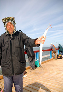 Dosłownie co chwila, nierzadko równocześnie kilku wędkarzy wyciągało z morza swoją zdobycz: długie, przypominające węgorze, ale bardziej płaskie i z długimi pyskami podobnymi do małych krokodylków belony, tłuste byczki, rzadziej flądry oraz drobnicę. Być może skuteczna okazuje się przyjęta. Większość wędkarzy łowi bowiem nie na robaki czy muchy, lecz na… mrożone krewetki kupowane w supermarketach.