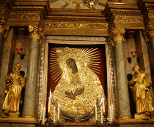 Jedynego znanego mi na świecie, tak popularnego obiektu kultu, widocznego przez całą dobę także z ulicy przez szyby dużego okna. Trafiłem na moment w którym nie odbywała się msza ani modły zbiorowe. Wewnątrz było zaledwie kilka osób, mogłem więc dowoli zachwycać się pięknem tego obrazu i jego pokrytej złotem srebrnej koszulki oraz tysiącami znajdujących się koło niego wotów.