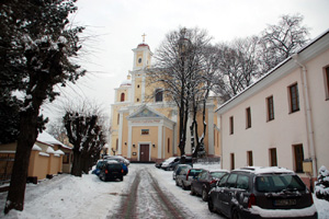 A ten trzynawowy kościół z dobudowaną 86–metrową dzwonnicą, przebudowany przez jezuitów w połowie XVIII w. w stylu późnego baroku, pamięta przecież czasy Władysława Jagiełły. Wewnątrz jest 10 rokokowych ołtarzy – wcześniej było ich 23 – oraz 5 kaplic. I sporo polskich pamiątek. M.in. w ścianie nawy północnej duża tablica z popiersiem poety Ludwika Kondratowicza (Władysława Syrokomli).