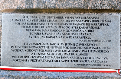 „Tu 27 września 1605 r. w jednej z większych w historii nowożytnej bitwie pod Kircholmem (Salaspils) wojska Korony Polskiej i Wielkiego Księstwa Litewskiego z udziałem sił Księstwa Kurlandii pod dowództwem hetmana Jana Karola Chodkiewicza pokonały przeważające siły szwedzkie króla Karola IX. Rząd Rzeczypospolitej Polskiej”.