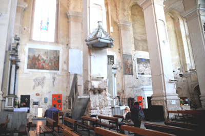 Zamieniony w czasach komunistycznych na jakiś magazyn, ma bowiem bardzo zdewastowane wnętrza. Zachowały się w nim jednak barokowe malowidła i część wyposażenia w tym stylu. Świątynia jest w remoncie, który zapewne potrwa długo, gdyż skala zniszczeń jest ogromna.