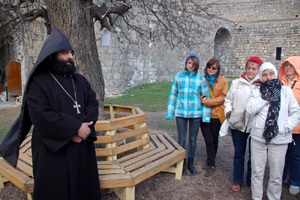 Głównym punktem programu kolejnego dnia, chyba z najładniejszą, przynajmniej do wieczora, pogodą podczas całej podróży: słoneczną z białymi obłokami, był klasztor Tatew z IX w. Jest on fantastycznie usytuowany na niewielkim płaskim terenie otoczonym niedostępnymi urwiskami. Jeszcze niedawno można się było do niego dostać tylko niezwykle krętą górską drogą pokonując ją wozami terenowymi w ciągu paru godzin.
