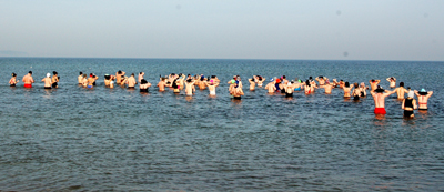 Rozbierających się do kąpieli, ale zachowujących na głowach włóczkowe lub cieplejsze nakrycia głowy, mnóstwo. Temperatura wody przy brzegu Zatoki Gdańskiej – sprawdziliśmy – wynosiła 1,4ºC. Jedni tylko chodzili po wodzie, aby następnie zanurzyć się na chwilę do pasa, lub nawet do szyi.