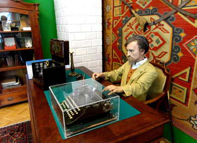 Wartych dokładniejszego obejrzenia eksponatów lub przeczytania opisów jest mnóstwo, także w kolejnych salach. W następnej za biurkiem, przy maszynie do pisania oraz otwartej podróżnej walizeczki z trunkami i szklanymi kieliszkami, siedzi naturalnej wielkości figura Henryka Sienkiewicza.