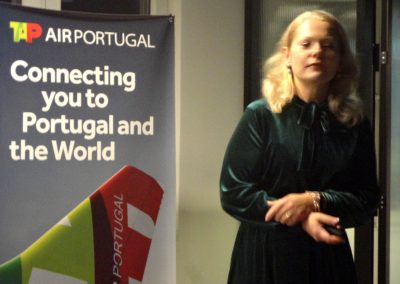 Drugą częścią spotkania była prezentacja TAP AIR Portugal. Przytoczę z niej kilka danych. W 2024 r. przewiozły one 15,9 mln pasażerów i 92 tys. ton ładunków cargo. Obsługują 80 kierunków, mają nowoczesną, chociaż bardzo zróżnicowaną flotę samolotów oraz „są obserwowane” przez 2,5 miliona osób w mediach społecznościowych. TAP latają do wielu miast w Europie, są bardzo ważnym przewoźnikiem na trasach do Brazylii i Wenezueli. Latają również do USA – właśnie ogłosiły nowe połączenia z Lizbony do Los Angeles i z Porto do Bostonu. Ponadto do Kanady, Meksyku i 13 portów lotniczych w Afryce.