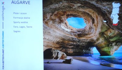 Natomiast szczególnie ulubionym przez polskich turystów portugalskim regionem jest Algarve. Tamtejsze miejscowości: Faro, Lagos, Sagres i Tavira, plaże i ocean z bogatą ofertą sportów wodnych. A także formacje skalne, z których jedna z najpiękniejszych pokazana na ekranie wzbudziła zachwyt uczestników spotkania. Nie zabrakło w tej prezentacji oczywiście słynnych portugalskich wysp na Atlantyku, zaliczanych już do kontynentu afrykańskiego: składającego się z 9 wysp archipelagu Azory z ich piękną i bujną przyrodą oraz Madery z łagodnym klimatem i szlakami górskimi oraz pobliską maleńką wysepką Porto Santo.