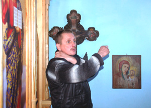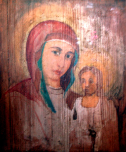 Wisi ona na ścianie po prawej stronie, obok zabytkowego krzyża z carskim orłem u stóp Chrystusa. Według legendy deska ta też przypłynęła Prypecią i używana była przez jedną z gospodyń w chlewie. W pewnym momencie pojawił się na niej początkowo niezbyt wyraźny obraz Matki Bożej i utrwalał coraz bardziej.Dodam, bo w przewodniku nie znalazłem na ten tema ani słowa, że wcześniej na miejscu tego cmentarza znajdował się według przekazów najstarszy na całej Rusi klasztor, działający w IX wieku jeszcze przed jej chrztem. Opisując drewniany dworek Kościuszków w Mereczowszczyźnie warto było wspomnieć, że jego replikę zbudowano ze środków amerykańskich.