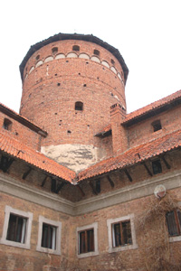 Blisko prawego narożnika wspomniana już, otynkowana na biało, cienka wieża dawnego protestanckiego zboru. Zachowały się też, od strony północnej, fragmenty murów obronnych z dwiema niższymi basztami oraz przejściem. Środkową – gdanisko – łączy z głównym korpusem zamku ceglana przewieszka. Natomiast narożna północno – wschodnia, która spłonęła w 1906 roku, odnowiona została w 1965 r. i nosi imię Wincentego Pola.