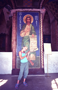 Dodam, że zachował się w niej również kamienny ikonostas. Muzealny charakter świątyni uniemożliwia praktycznie fotografowanie jej wnętrz, chociaż jedno zdjęcie, fresku „Mojżesz”, zdołałem zrobić, oczywiście bez flesza i zamieszczam je. Nie ma też warunków aby cerkiew sfotografować z zewnątrz. Stoi bowiem na wzgórzu, otoczona dosyć gęsto wysokimi drzewami.