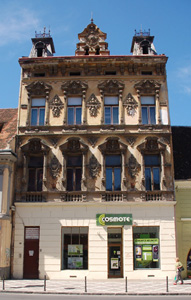 A dookoła tego rozległego placu – zabytkowe kamieniczki. Jak również trochę niezwykła cerkiew prawosławna Sfânta Adormire a Maicii Domnului zbudowana według wzorów bizantyjskich w końcu XIX wieku. Przy czym w sposób trochę zaskakujący. W północno – wschodnią pierzeję rynku, między kamienice i sklepy, wciśnięto bowiem portal z wieżyczką na szczycie.