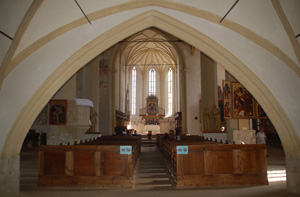Cenna jest w nim również brązowa chrzcielnica z 1440 roku oraz kolekcja na ścianach 35 wschodnich, anatolijskich kobierców. To dary kupców wracających z udanych podróży na Wschód. Tego rodzaju wota spotkać można w wielu zabytkowych świątyniach siedmiogrodzkich. 64 metrowej wysokości Wieża Zegarowa – nazwę zawdzięcza zegarowi z 1648 roku, którego skomplikowany mechanizm porusza figurki znajdujące się po dwu stronach wieży – jest najbardziej znaną budowlą i wizytówką miasta.
