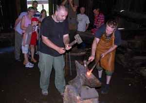 Młot uderza co sekundę, drewniane miechy dostarczają natlenionego powietrza, co przyspiesza nagrzewanie i spalanie znajdującego się w piecu wsadu. Rozżarzone kawałki żelaza kuźnicy przekuwają na lemiesze, siekiery i inne narzędzia. Z przeszłości tej wodnej kuźnicy wiadomo, że obecny budynek zbudowano w 1835 roku.