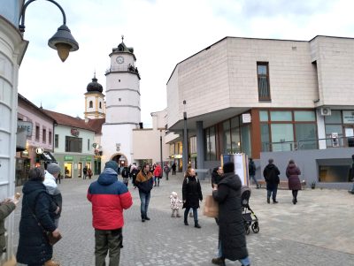 U podnóża zamku znajduje się zabytkowe centrum z brukowanymi uliczkami i malowniczymi kamieniczkami. Rynek: Plac Pokoju (Mierové námestie) to centralny plac miasta, otoczony kolorowymi kamienicami z sympatycznymi kawiarniami i widokiem na górujący nad miastem malowniczy zamek.