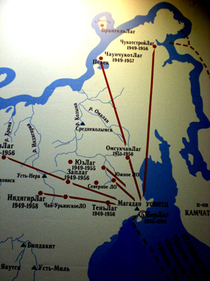 Kilka dni później w drodze powrotnej z Syberii do Ameryki, zwiedzamy Moskwę. W pobliżu naszego hotelu przypadkowo natrafiamy na prywatne Muzeum Lagrów. Mieści się w zwykłym bloku mieszkalnym i jest finansowane ze składek i donacji z całej Rosji. Nie ma statusu państwowego muzeum, a co za tym idzie żadnego rządowego wsparcia. Na dwóch piętrach znajdują się niezliczone ilości eksponatów i map, na których zaznaczone jest położenie łagrów na terenie całej Rosji. I te mapy zwracają moją uwagę.