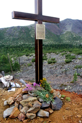 Obawiałem się, ze Rosjanie zrobią jakiś prosty krzyż ze zbitych na krzyż dwóch belek. I jakież było miłe rozczarowanie gdy zobaczyliśmy duży (220cm wysoki + 70cm do ziemi i 90 cm rozpiętość ramion, ważący ponad 50 kg) i piękny KRZYŻ, wykonany z nasyconego żywicą syberyjskiego modrzewia, z bocznymi frezami. Miejsce, w którym stanął, wybrali nasi rosyjscy przewodnicy i jest ono bardzo godne, gdyż stoi na kamiennym wysypisku, które przypomina ogromną mogiłę, a na dodatek jest on widoczny z całego łagru. Czy to tylko zwykły przypadek?